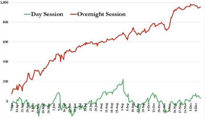 Приведенный выше график отражает абсолютную динамику S&P 500 в пунктах во время регулярной торговой сессии (зеленым) и за ее пределами (красным). Источник: Goldman Sachs, Reuters
