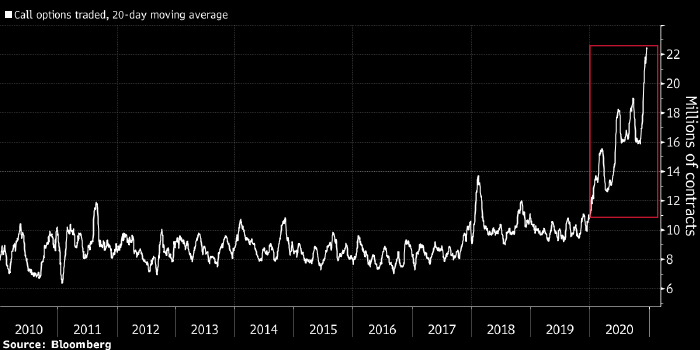 Приведенный выше график отражает динамику среднего 20-дневного объема торгов колл-опционами на акции на площадках США (в млн контрактов). Источник: Charles Schwab, Bloomberg