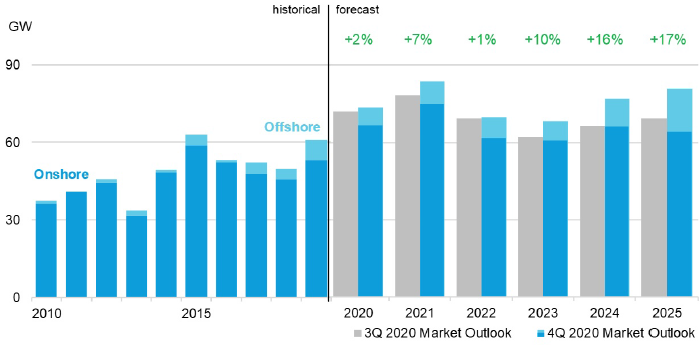 Ожидается, что в 2021 году мощность новых ветровых установок составит 84 гигаватта, однако в последующие годы прирост новых наземных установок выйдет на плато, и большая часть роста продолжится в море.