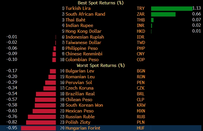 Российский рубль, польский злотый, венгерский форинт и мексиканское песо стали самыми слабыми развивающимися валютами в пятницу, при этом турецкая лира и южноафриканский ранд продемонстрировали значительный рост.