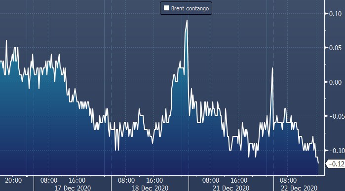 Вчера цена нефти Brent рухнула на 5% с лишним (рекордное значение за последние семь недель) из-за опасений того, что новый штамм Covid-19 перекинется на Европу и остальной мир. Это событие привело к росту контанго* в ближайших фьючерсах (февраль и март 2021 года, см. график ниже — прим. ProFinance.ru), что говорит об усилении краткосрочных опасений инвесторов.