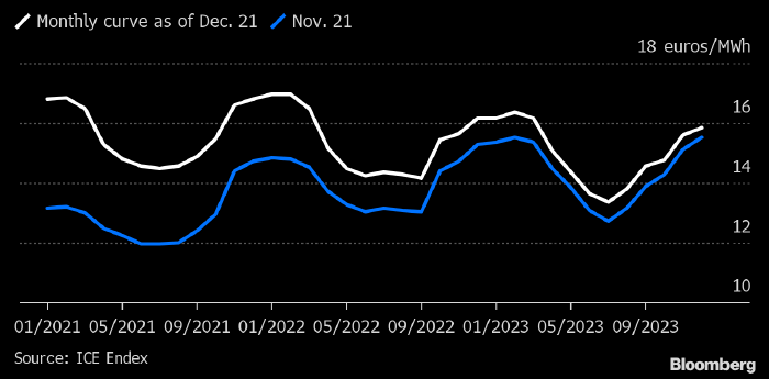 Приведенный выше график отражает кривую фьючерсов на газ на TTF по состоянию на 21 декабря (белым) и 21 ноября (голубым). Источник: Bloomberg