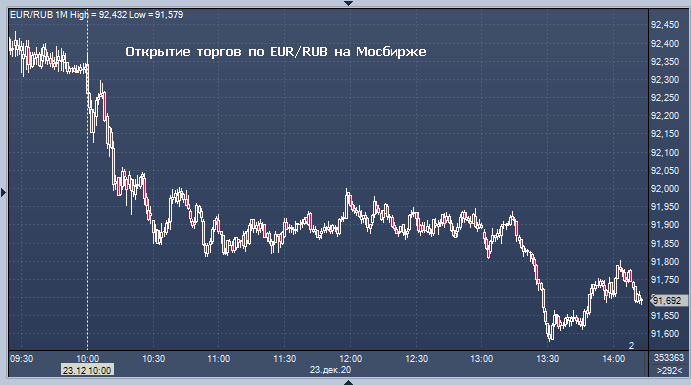 Таким образом, по официальному курсу ЦБ доллар вырос к рублю на 11 копеек, а евро упал к рублю на 8 копеек по сравнению с официальным курсом среды. Объем торгов на Московской бирже к 14:07 мск среды составил 946,2260 млрд рублей или 12 557,7777 млн долларов. Рубль и российские акции сегодня консолидируются перед длинными рождественскими каникулами. Поскольку главную скрипу на российском рынке в последние месяцы играют международные инвесторы и внешние факторы, российский рынок может впасть в анабиоз на ближайшие три торговые сессии. 25 декабря в западных странах празднуется католическое Рождество.