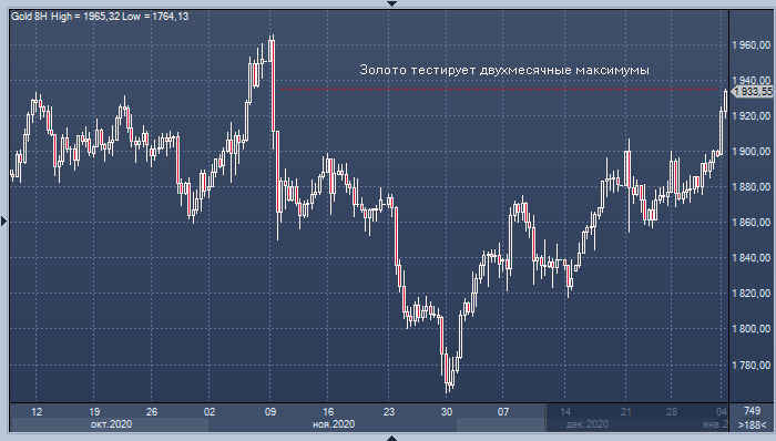 Цена золота сегодня выросла примерно на 2% и достигла области двухмесячных максимумов около $1935 за унцию. Серебро показывает еще лучшую динамику, дорожая на 3% и штурмуя рекордные уровни с сентября.