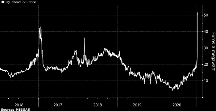 В Испании цена природного газа и вовсе превысила 50 евро за мегаватт, что стало абсолютным рекордом за всю историю. С начала года цены на газ выросли здесь в два с лишним раза. Страна является ключевым звеном в мировой цепочке поставок СПГ, так как именно здесь сконцентрировано наибольшее в Европе число СПГ-терминалов.