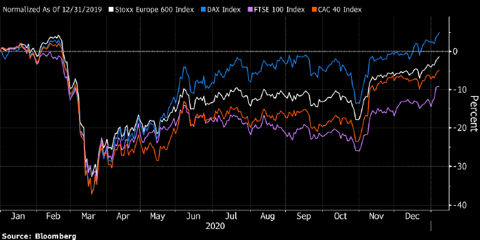 График индексов Stoxx Europe 600, DAX, FTSE 100 и CAC 40. Источник: Bloomberg