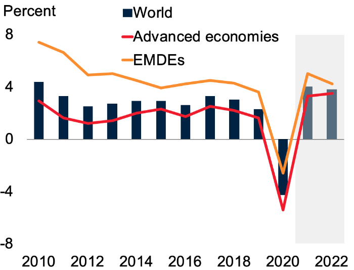 В 2021 году мировая экономика будет восстанавливаться бодрыми темпами, уверены в банке. Массовая вакцинация придаст ей ускорение. Но даже если эта экспансия оправдает прогнозы и обойдется без новых потрясений, показатель мирового объема производства все равно будет на 5.3% ниже прогнозов Всемирного банка, сделанных до пандемии: это еще минус $4.7 трлн.
