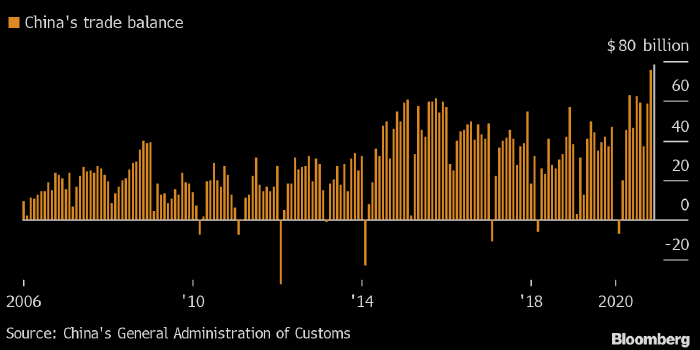 Профицит торгового баланса Китая достиг в декабре рекордных $78,2 млрд, а по результатам всего 2020 года этот показатель составил $535 млрд (+27% г/г, рекордные цифры с 2015 года).