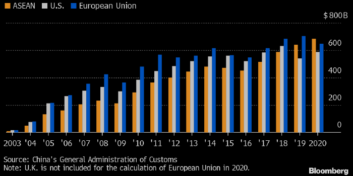 Объем торговли Китая со странами ASEAN (оранжевым), США (белым) и ЕС (голубым) в млрд долларов. Источник: Bloomberg