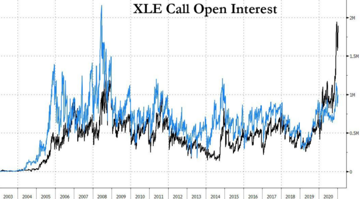 Эксперт указывает на резкий рост открытого интереса к колл-опционах на XLE (биржевой фонд (ETF) акций энергетических компаний из Energy Select Sector Index), который наблюдался в последние недели. Благодаря этому событию отношение колл-пут в XLE взлетело до рекордных значений.