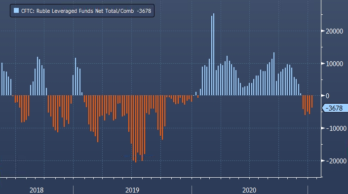 На иллюстрации представлена нетто-позиция по фьючерсам на рубль к доллару фондов, использующих кредитное плечо.