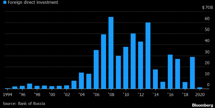 График прямых иностранных инвестиций в Россию в млрд долларов в год. Источник: Bloomberg