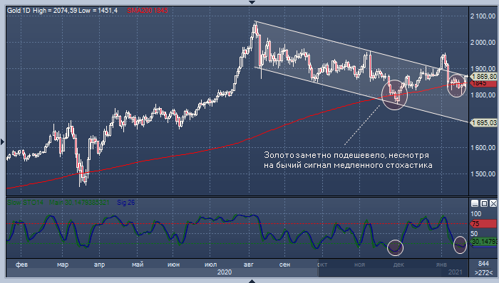 Теперь золото нашло поддержку в области прохождения 200-дневной скользящей средней, а медленный стохастик генерирует бычий сигнал. С одной стороны, эти факторы говорят в пользу роста золота, а с другой — трейдерам следует помнить о том, что схожая техническая картина, которая сложилась в середине ноября, привела к снижению драгметалла на 6% с лишним.