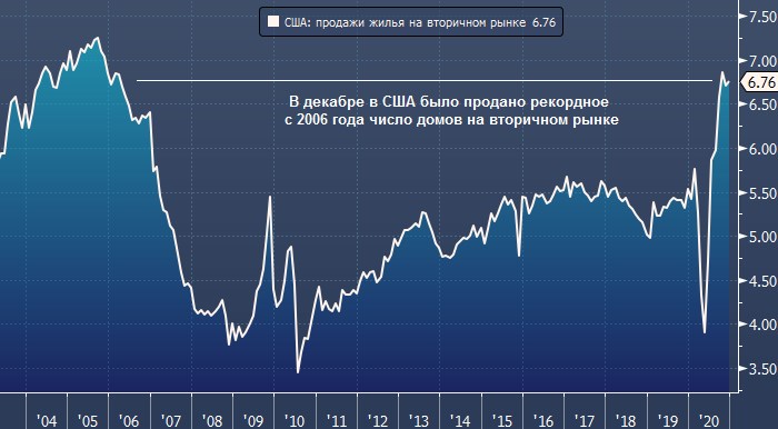 В декабре на вторичном рынке жилья США были проданы 6,76 млн объектов недвижимости, что оказалось на 0,7% больше, чем месяцем раньше. Кроме того, это стало рекордным значением с 2006 года, когда рынок сдувался после разрыва пузыря, который повлек за собой мировой финансовый кризис 2008-2009 годов.
