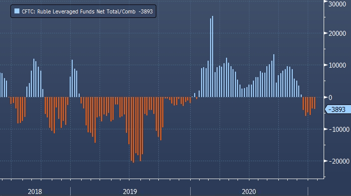 На иллюстрации представлена нетто-позиция по фьючерсам на рубль к доллару фондов, использующих кредитное плечо.