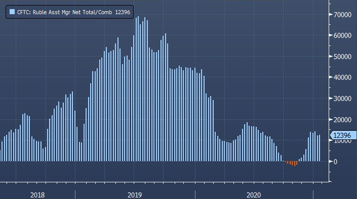 На иллюстрации представлена нетто-позиция по фьючерсам на рубль к доллару управляющих активами.