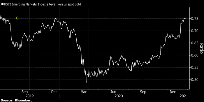 Благодаря этому отношение фондового индекса развивающихся стран MSCI Emerging Markets Index к цене золота взлетело до 18-месячного максимума, хотя оба актива заметно подорожали с весны на фоне снижения курса доллара.