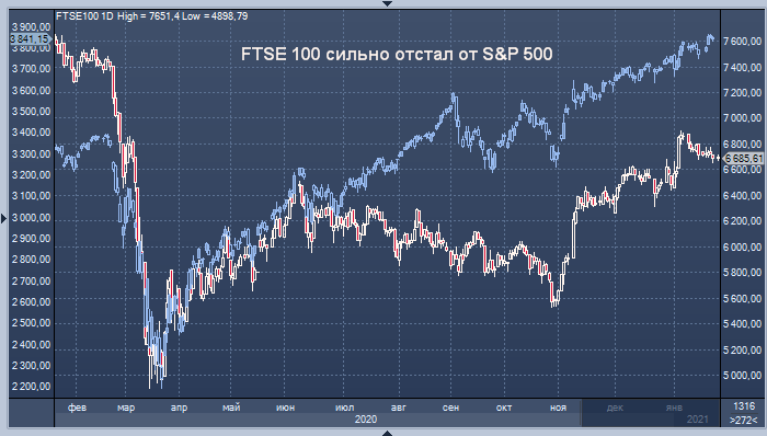 График FTSE 100 (красно-белым, правая ценовая шкала) и S&P 500 (голубым, левая шкала) интервалами 1 день