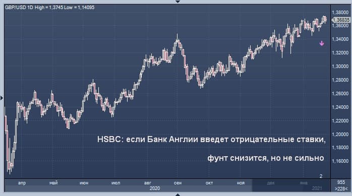 Это означает, что отрицательные ставки вряд ли окажут «значительное долгосрочное влияние» на фунт, говорит он. HSBC ожидает, что Банк Англии оставит базовую процентную ставку на уровне 0,10% «по крайней мере в этом и следующем году», но будет «держать дверь открытой» для отрицательных ставок.