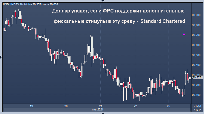 Доллар, вероятно, ослабнет, если председатель Федеральной резервной системы Джером Пауэлл по итогам заседания регулятора по вопросам ДКП в среду укажет, что он видит необходимость в дальнейшем крупномасштабном фискальном стимулировании, сообщает Standard Chartered.