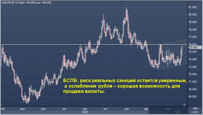 Глава аналитического управления Банка Санкт-Петербург Андрей Кадулин также считает, что риск реальных санкций остается умеренным, а ослабление рубля — хорошая возможность для продажи валюты, так как приток от внешнеторговых операций продолжит поддерживать рубль в ближайшие месяцы.