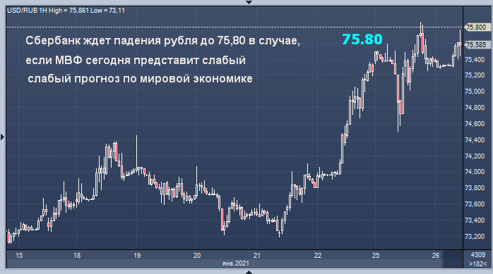 Специалисты Сбербанка объясняют слабость рубля и других валют развивающихся рынков возможной задержкой со стимулированием экономики США в отсутствие позитивных новостей и других значимых факторов. Во вторник на рынок может оказать давление новый прогноз МВФ по темпам роста мировой экономики, если он окажется недостаточно оптимистичным. В этом случае рубль может подешеветь до 75,8 руб./$1.