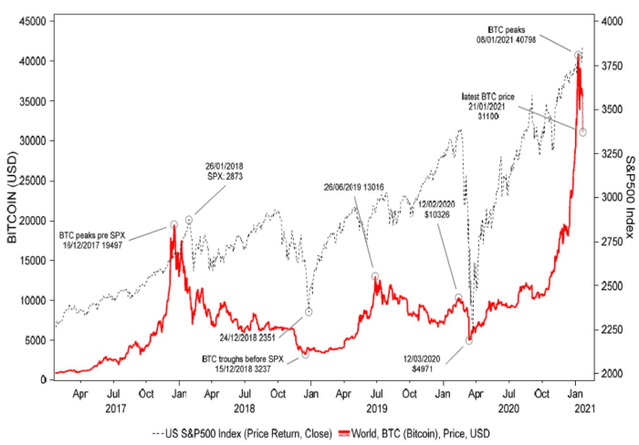 У нас есть дешевые кредиты. У нас есть убедительные истории для некоторых технологических секторов. А где же нестандартное поведение? Для начала, возьмем биткоин, который просто взорвался в прошлом месяце. Сильные ценовые скачки биткоина, как правило, пересекаются с переломными точками на рынках акций.