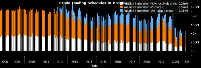 Объем экспорта нефти через порт Новороссийска (белым), Приморска (оранжевым) и Усть-Лугу (бирюзовым) в млн б/д. Источник: Bloomberg
