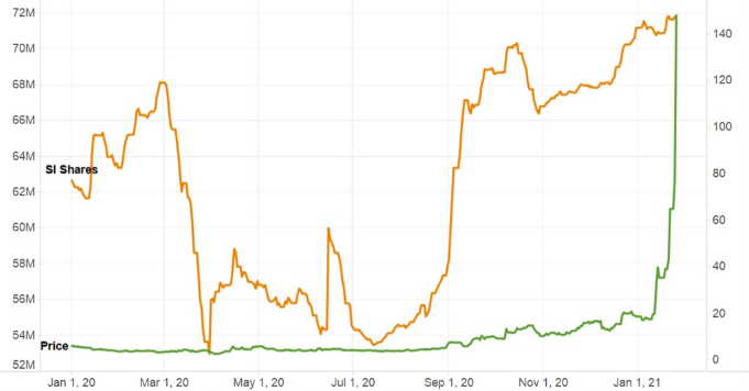 Короткий интерес в акциях Gamestop в кол-ве акций (оранжевым, левая ценовая шкала) и стоимость акций (зеленым, правая шкала) в период с 1 по 26 января включительно. Источник: S3 Partners