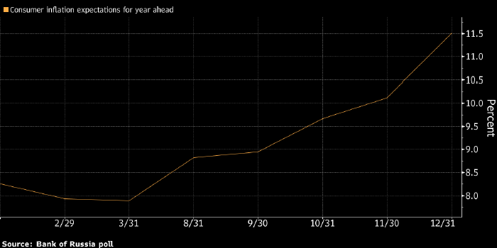 Инфляционные ожидания российских потребителей. Источник: Банк России, Bloomberg