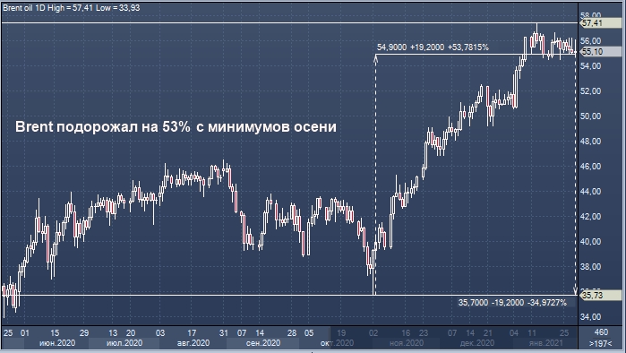 Цены на нефть вечером в пятницу, 29 января, торговались без особой динамики. Котировки Brent +0,05% до $55,12 за баррель. Рост с начала года составляет 7,8%. При этом американская нефть WTI прибавляет в этом году на 7,9%. В пятницу она к вечеру теряла в цене 0,04% до $52,34 за баррель.