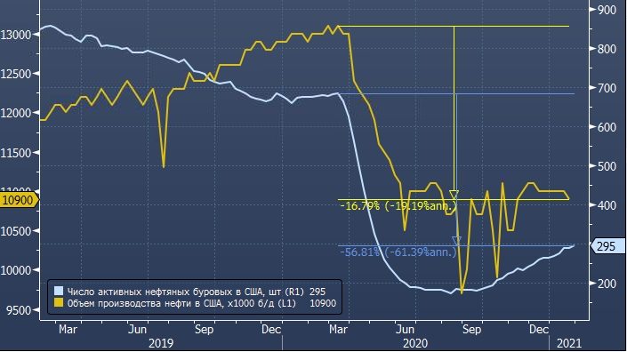 С пика марта 2020 года буровые сократились на 57%, при этом объем производства нефти в США упал на 18%.