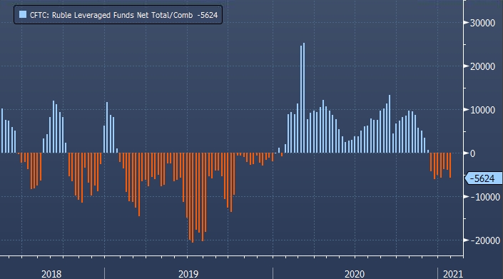 На иллюстрации представлена нетто-позиция по фьючерсам на рубль к доллару фондов, использующих кредитное плечо.