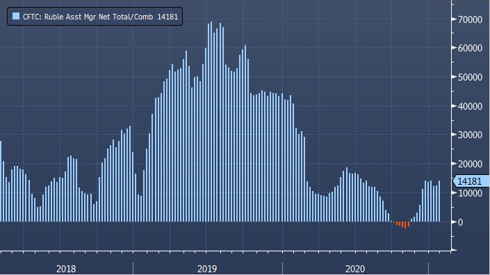 На иллюстрации представлена нетто-позиция по фьючерсам на рубль к доллару управляющих активами.
