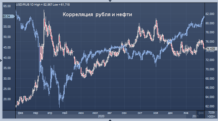 График рубля к доллару и график нефти марки Brent интервалами в 1 день