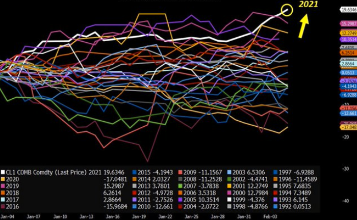 Цены на нефть WTI демонстрируют рекордный рост за последние тридцать лет (+20% с лишним с начала года — прим. ProFinance.ru), отмечает управляющий активами Crescat Capital ($200 млн под управлением) Отавио Коста. От нее несильно отстают и другие товарные активы.