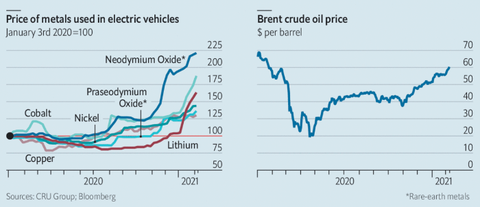 По данным консалтинговой компании CRU Group, на долю электромобилей приходится около четверти спроса на кобальт, аналогичная доля приходится на неодим и празеодим и почти половина спроса на литий. Другие зеленые технологии также поддерживают цены на металлы. Медь необходима не только для электромобилей, но и для солнечных батарей, ветряных турбин и инфраструктуры 5G. Поэтому недавнее ралли может быть признаком необъяснимой модели будущего: более высокие цены как на нефть, так и на металлы, которые помогают ее заменить.