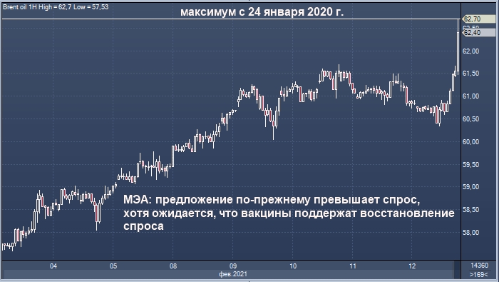 Международное энергетическое агентство (МЭА) заявило, что предложение нефти по-прежнему превышает мировой спрос, хотя ожидается, что вакцины от COVID-19 поддержат восстановление спроса.