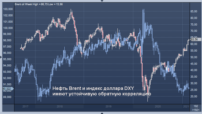 График цены нефти Brent (красно-белым) и индекса доллара DXY (голубым) интервалами 1 неделя