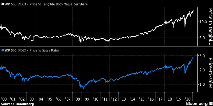 Отношение капитализации компаний из S&P 500 к их балансовой стоимости (вверху) и показатель P/S для индекса S&P 500 (внизу). Источник: Bloomberg