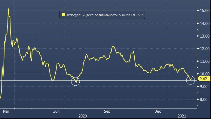 Индикатор вмененной волатильности для рынков Emerging Markets, рассчитываемый JP Morgan, опустился до минимума с июля. Это отражает оптимизм в отношении восстановления мировой экономики благодаря вакцинации и ожиданиям новых стимулов правительства США.