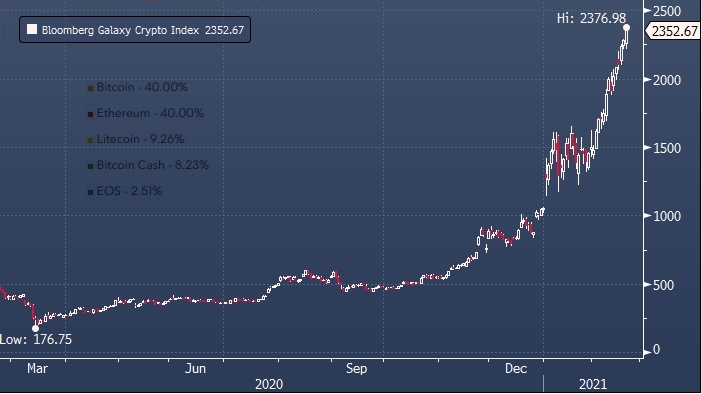 Индекс Bloomberg Galaxy Crypto, который включает биткойн и четыре альткоина, увеличился более чем вдвое с начала текущего года.
