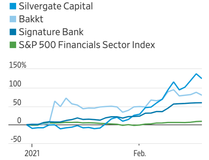 Некоторые банки предлагают услуги доверительного хранения долларов, которые используются, как обеспечение криптоовалют, или обслуживают поставщиков криптовалютных услуг, например, криптобиржи. Их акции стремительно растут. Базирующийся в Калифорнии банк Silvergate Capital, который в течение нескольких лет в основном обслуживал криптофирмы, сообщил, что с третьего квартала и до конца года депозиты в цифровой валюте выросли на 138% до $5 млрд. Его акции выросли более чем на 100% в 2021 году и примерно в 10 раз за последний год. Silvergate управляет платежной сетью, связывающей эти фирмы. В это пространство приходят новые банки, и он стремится развивать другие услуги, такие как кредитование с обеспечением в криптовалюте.