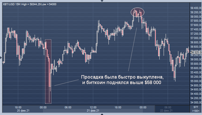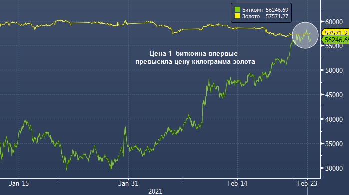 В ночь с субботы на воскресенье комментарий Илона Маска о том, что биткоин выглядит дороговато, спровоцировал резкое снижение котировок криптовалют, которое, впрочем, было довольно быстро выкуплено. Все воскресенье биткоин дорожал и в ночь на понедельник превысил отметку $58 000, что позволило ему впервые в истории стать дороже килограмма золота.