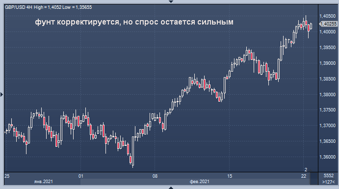 В начале лондонских торгов в понедельник фунт достиг нового трехлетнего максимума в 1,4050 доллара, а затем стабилизировался на уровне 1,40 доллара. Инвесторы делают ставку на то, что вакцинация в Великобритании приведет к восстановлению экономики.
