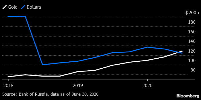 Объем золота (белым) и долларов (голубым) в ЗВР России в млрд долларов. Источник: Bloomberg