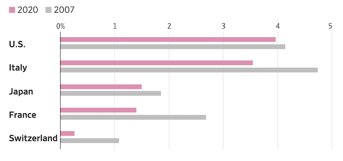 Государственные займы достигли рекордного уровня в 2020 году, однако стоимость процентных платежей оказалась ниже, чем в 2007 году, в последний год перед глобальным финансовым кризисом, который привел к первой волне роста уровня долга.