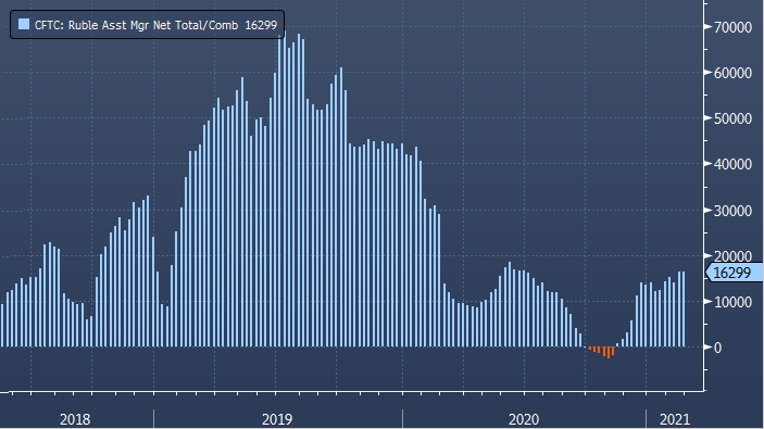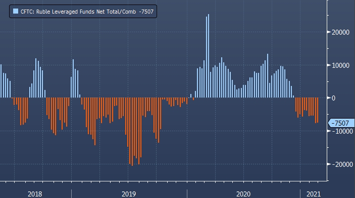 Если оценить статистику CFTC по рублю более подробно, то можно отметить, что сальдированная короткая позиция тех участников рынка, которые торгуют с кредитным плечом (leveraged funds), сократилась на 2,5% (189) до минус 7 507 контрактов на отчетной неделе. Позиция leveraged funds остается короткой вот уже 11 недель подряд. Именно так и было большую часть 2019 года, однако в 2020 году ситуация резко изменилась.