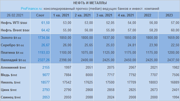 С конца января прогнозы по ценам на нефть изменились в сторону увеличения. Рынок стал более позитивно оценивать перспективы черного золота, делая ставку на то, что вакцинация приведет к быстрому восстановлению спроса на энергоносители. Большой вклад в улучшение фундаментальных перспектив рынка внесла Саудовская Аравия, которая добровольно решила увеличить объем сокращения производства на 1 млн б/д. Это позитивно повлияло на настроения рынка и прогнозы. Проводимые во многих странах мира увеличили надежды на то, что в 2021 г. удастся увидеть уверенное экономическое восстановление, что приведет к росту спроса на сырье. При этом текущие уже улучшенные прогнозы заметно ниже текущих значений по нефти Brent и WTI.
