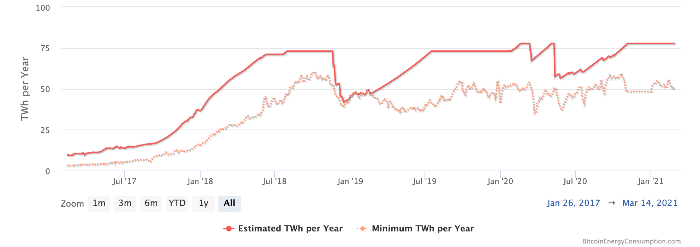 По оценкам Кембриджского центра альтернативных финансов, в год биткоин потребляет энергию в объеме чуть выше 115 тераватт-часов (ТВт·ч), в то время как индекс Digiconomist указывает на 80 ТВт·ч.